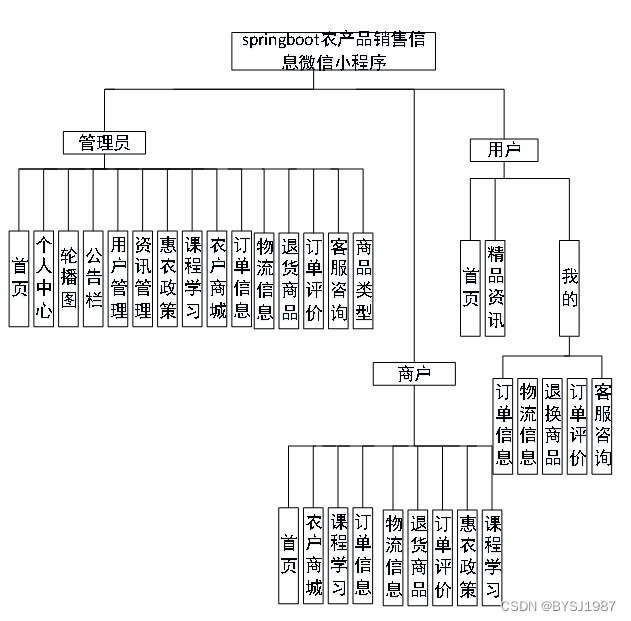 对于本农产品销售信息系统的设计来说,它主要是采用后台采用java语言、springboot框架,它是应用mysql数据库、微信小程序等技术动态编程以及数据库进行努力学习和大量实践,并运用到了微信小程序的建设中在整个系统的设计当中,具体根据网上农产品销售信息系统的现状来进行开发的,具体根据用户需求实现网上农产品销售信息系统网络化的管理,各类信息有序地进行存储,进入农产品销售信息系统页面之后,方可开始操作主控界面,系统功能包括管理员服务端:首页、网站管理(轮播图、公告信息)人员管理(管理员、会员用户、农户用户)内容管理(精品资讯、资讯分类)模块管理(惠农政策、课程学习、农户商城、订单信息、物流信息、退换商品、订单评价、客服咨询、商品类型)个人管理;用户客户端:首页、精品资讯(订单信息、物流信息、退换商品、订单评价、客服咨询)等功能。