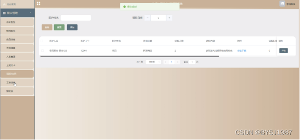 请假信息管理,在请假信息管理页面中可以查看索引、医护人员、医护工号、医护姓名、请假标题、请假天数、请假内容、附件、请假日期等信息,并可根据需要进行修改或删除等详细操作,如图5-11所示。