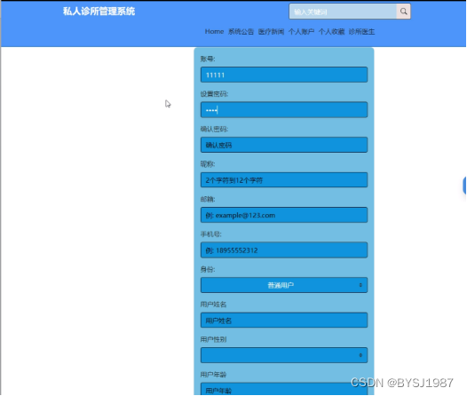 用户注册,在注册页面中通过填写账号、密码、昵称、邮箱、手机号、身份、用户姓名、用户性别、用户年龄等信息进行修改,如图5-7所示。