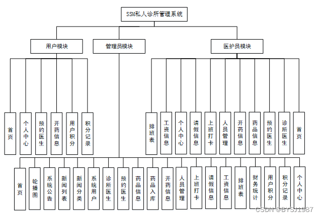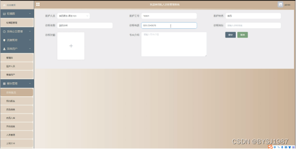 This article uses Java as the development technology to implement a private clinic management system. The main users of the private clinic management system are administrators, medical staff, and ordinary users; Medical staff: backend homepage, module management (clinic doctors, appointment doctors, medication information, medication information, personnel management, clock in, leave information, salary information, and scheduling); Users: backend homepage, module management (appointment of doctors, medication information, user points, point records), personal center; Administrators: homepage, carousel map (carousel map management), system announcement management (system announcement), resource management (news list, news classification), system users (administrators, medical staff, ordinary users) Module management (clinical doctors, appointment doctors, drug information, drug storage, medication information, personnel management, clock in, leave information, salary information, shift schedule, financial statistics, user points, point records), personal center, and other functions. Through the design of these functional modules, the entire process of private clinic management system has been basically implemented.