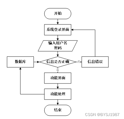 用户打开并进入系统后,会先显示登录界面,输入正确的用户名和密码,系统自动检测信息,若信息无误,则用户会进入系统功能界面,进行操作,否则会提示错误无法登录,操作流程如图3-3所示。