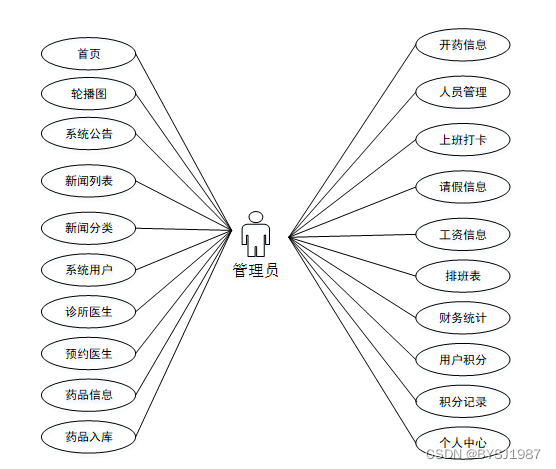 系统中的核心用户是系统管理员,管理员登录后,通过管理员菜单来管理后台系统。主要功能有:首页、轮播图(轮播图管理)、系统公告管理(系统公告)、资源管理(新闻列表、新闻分类)、系统用户(管理员、医护人员、普通用户)、模块管理(诊所医生、预约医生、药品信息、药品入库、开药信息、人员管理、上班打卡、请假信息、工资信息、排班表、财务统计、用户积分、积分记录)、个人中心等功能。管理员用例如图3-7所示。