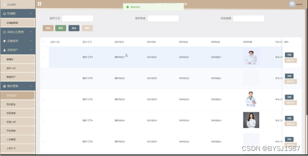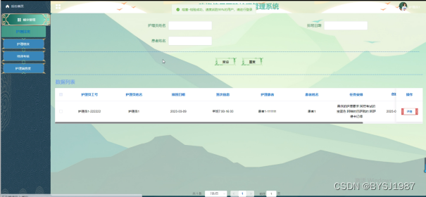 排班表管理,在排班表管理页面中可以查看索引、排班编号、医护人员、排班附件、排班日期等信息,并可根据需要进行修改或删除等详细操作,如图5-5所示。