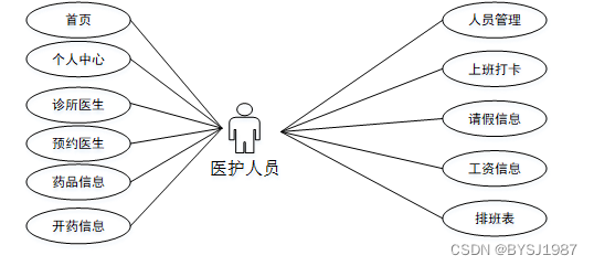 医护人员进入系统可以进行首页、模块管理(诊所医生、预约医生、药品信息、开药信息、人员管理、上班打卡、请假信息、工资信息、排班表)、个人中心管理等。医护人员用例如图3-8所示。