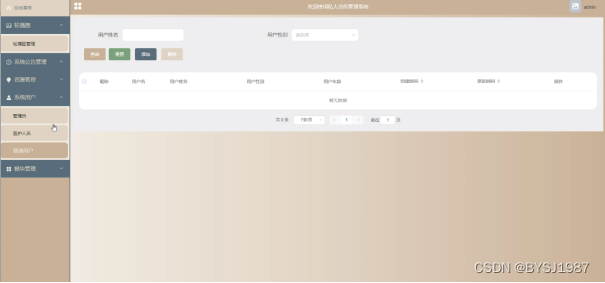 系统用户管理,在系统用户管理页面中可以查看索引、昵称、用户名、用户姓名、用户性别等信息,并可根据需要进行添加、修改或删除等详细操作,管理员可以添加患者和医护人员账号如图5-3所示。