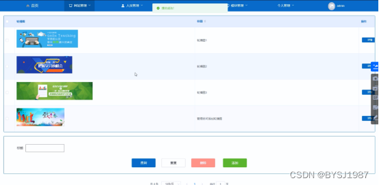 (2)网站管理:当点击“网站管理”这一菜单的时候,会出现公告信息+轮播图这两个个子菜单,可以对这两个模块进行增删改查操作;
