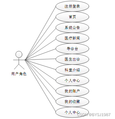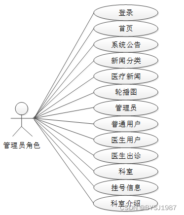 通过2.3功能的分析,得出了本医院挂号预约管理系统的用例图: