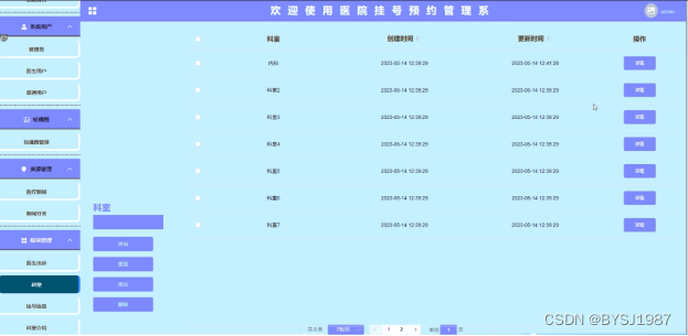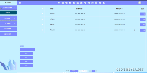 (6)模块管理:在“模块管理”这一菜单下,我们会看到医生出诊、科室、挂号信息、科室介绍,管理员可以对其进行增删改查操作。