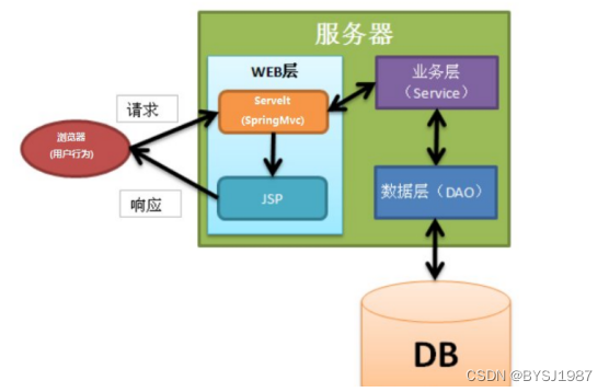 页面发送请求给控制器,控制器调用业务层处理逻辑,逻辑层向持久层发送请求,持久层与数据库交互,后将结果返回给业务层,业务层将处理逻辑发送给控制器,控制器再调用视图展现数据。