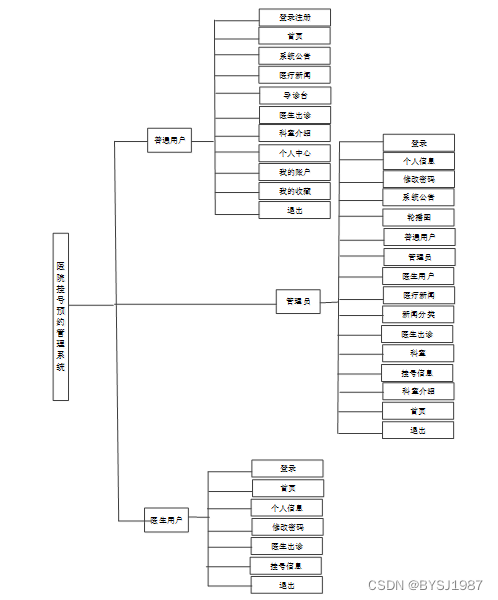 按照医院挂号预约管理系统的角色,我划分为了医生用户管理模块、普通用户模块和管理员管理模块这三大部分。