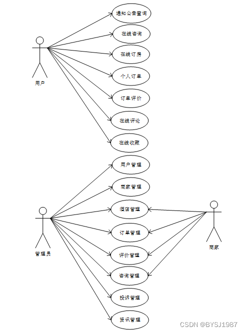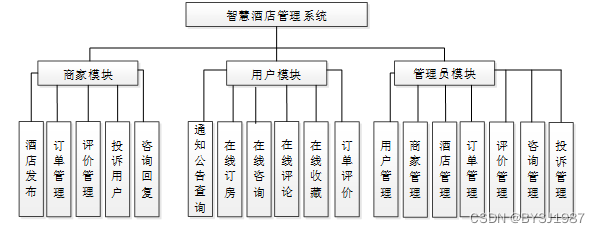 智慧酒店管理系统的用户角色有一下三种:后台管理员,用户展示页面和商家展示页面。后台管理员在本智慧酒店管理系统中可以进行订单管理、用户管理、酒店管理、资讯管理、投诉管理、咨询管理、评价管理、通知管理。用户所能实现的功能有:修改自己的密码等个人信息、在线订房、评价订单、查看资讯等等。
