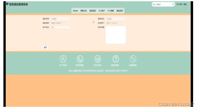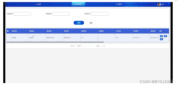Jianghai Four Seasons Smart Hotel Management System mainly uses IDEA as a system development tool, Springboot technology as the language basis for functional implementation, MySQL as the management center of system data, and has staff to solve the problem of information storage and management, mainly used for customer notification announcement query, hotel information browsing, hotel browsing, online booking, online consultation, hotel collection, personal ordering, online payment, hotel manager's order evaluation and data management functions, Cooperate with HTML5 web page technology to realize the system page layout, so that the layout of functional modules is clear and the system interface is beautiful and generous. The basic framework of the system is based on the B/S architecture, which realizes the division of system roles, so that the functional permissions of various roles are fully implemented, and the system functions are accurately tested through a large number of real-time data to ensure the accuracy and accuracy of system functions.