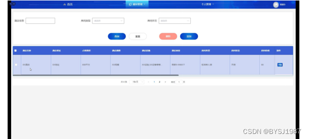 在主页左侧菜单栏中点击“酒店管理”按钮,再从二级目录中点击“查询酒店”按钮,进入到查询酒店界面。在此处酒店可以查询当前所有酒店记录。