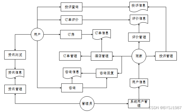 后台管理员拥有全部的管理员权限,可以添加、删除和修改用户信息。同时会更新后台数据库的内容。用户还可以在登录后查看通知和公告查询,查看酒店信息,浏览酒店,在线预订,在线咨询,收藏酒店,个人订单,在线支付,评价订单等等。用户的操作同样也会上传同步更新数据库。