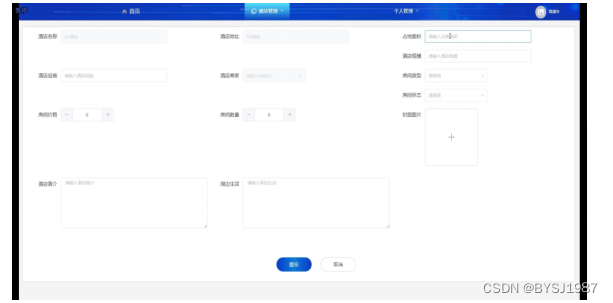 在主页左侧菜单栏中点击“酒店管理”按钮,再从二级目录中点击“新增酒店”按钮,进入到新增酒店界面。在此处酒店可以添加酒店的酒店名称、酒店地址、占地面积、酒店规模、酒店设施、酒店商家、房间类型、房间状态、房间价格。