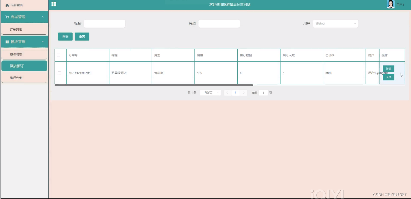 酒店预订管理,在酒店预订页面可以查看订单号、标题、房型、价格、预订数量、预订天数、总价格、用户等内容,并可根据需要进行支付、修改或删除操作,如图5-7所示。