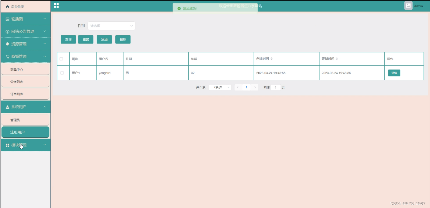 在管理员功能页面可以后台首页、轮播图(轮播图管理)、网站公告管理(网站公告)、资源管理(旅行资讯、资讯分类)、商城管理(商品中心、分类列表、订单列表)、系统用户(管理员、注册用户)、模块管理(地区管理、景点分类、房型管理、景点信息、景点购票、酒店信息、酒店预订、旅行分享)等内容进行相对应操作,如图5-11所示。