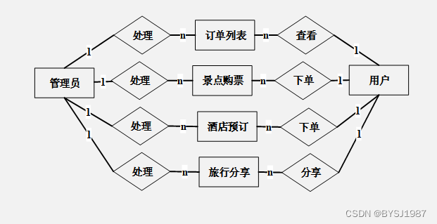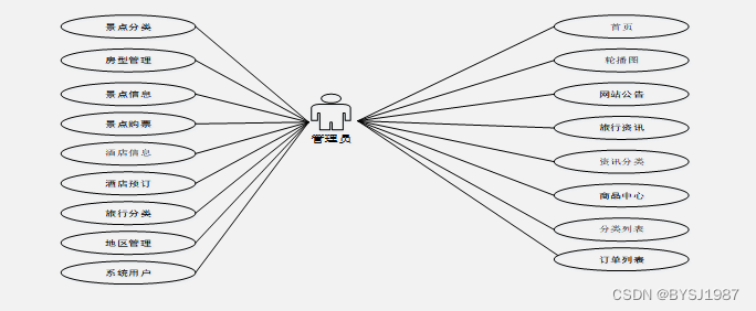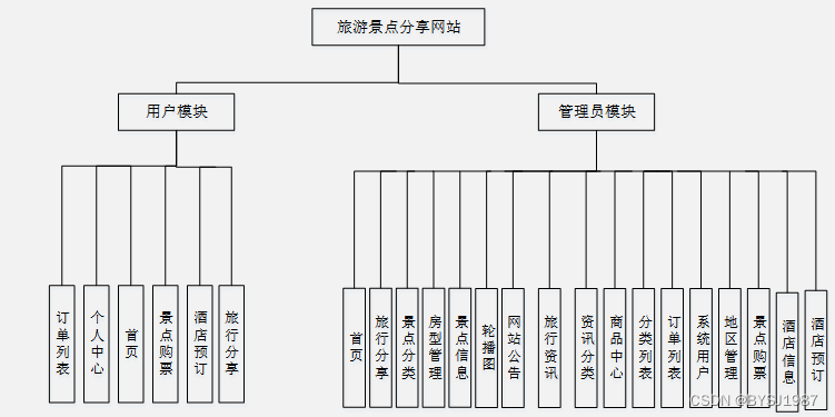 旅游景点分享网站基于现有的手机,可以实现管理员:首页、轮播图(轮播图管理)、网站公告管理(网站公告)、资源管理(旅行资讯、资讯分类)、商城管理(商品中心、分类列表、订单列表)、系统用户(管理员、注册用户)、模块管理(地区管理、景点分类、房型管理、景点信息、景点购票、酒店信息、酒店预订、旅行分享)等详细的了解及统计分析。根据系统功能需求建立的模块关系图如下图: