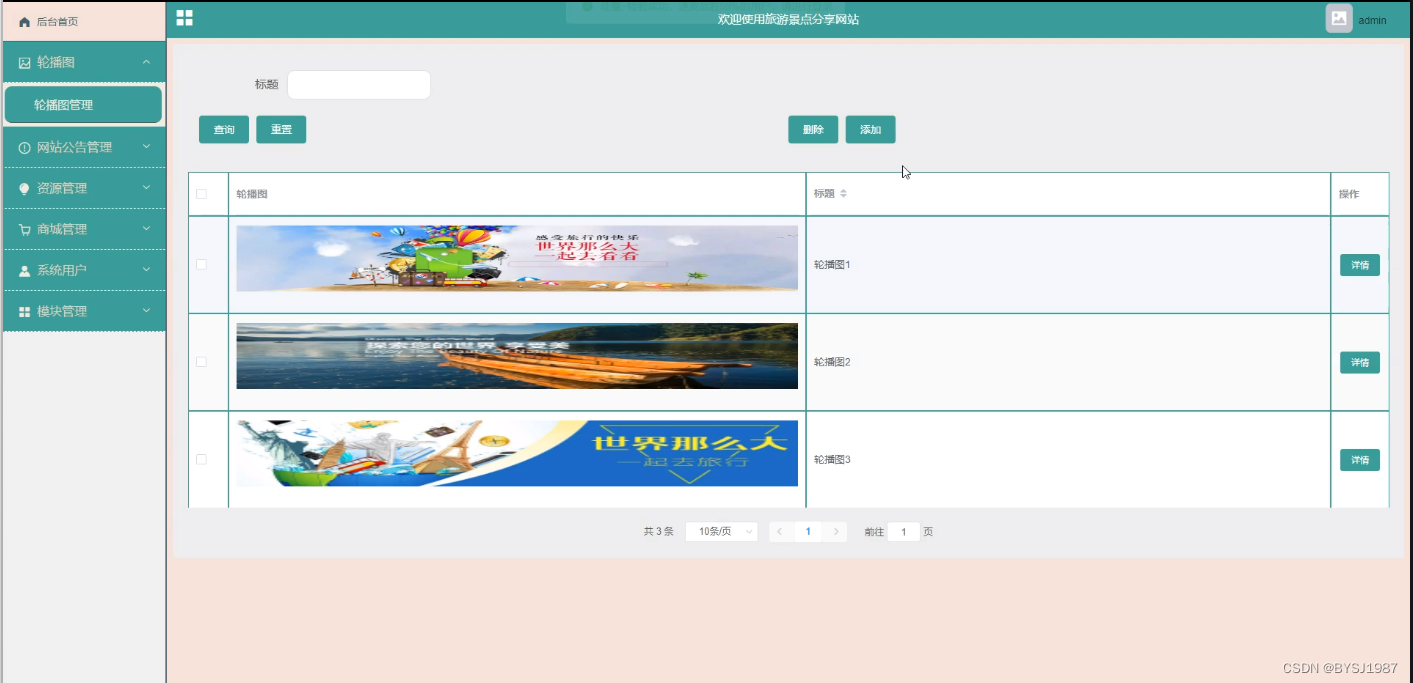 轮播图管理,管理员通过输入标题、轮播图等内容,根据详情进行添加、查询、删除等操作提交,如图5-10所示。