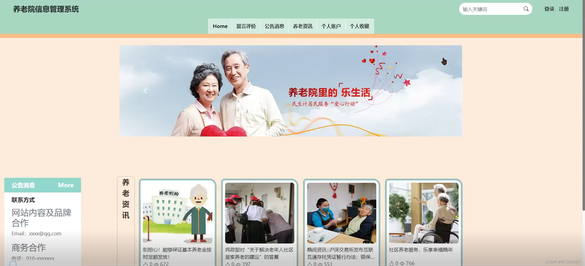 养老院信息管理系统实现系统主要功能:首页、系统用户(管理员、用户、护工)模块管理(老人管理、养老资讯、公告信息、老人日常)管理。养老院内部管理系统以院方人、财、物综合管理为核心,包含、房间管理、收费管理、健康情况、收支报表管理层决策智能分析等功能,系统采取一体化的运营模式,可作为提高院方综合运营能力的有效手段。
