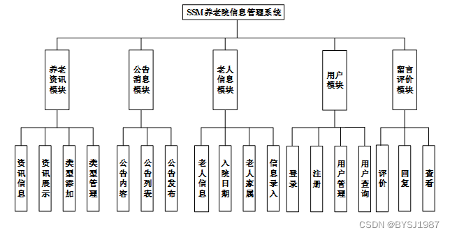 (1)功能要求:可以进行用户管理(管理员、家属用户、护工)资讯管理、资讯分类管理、老人信息管理、评价留言管理、老人日常等功能模块。