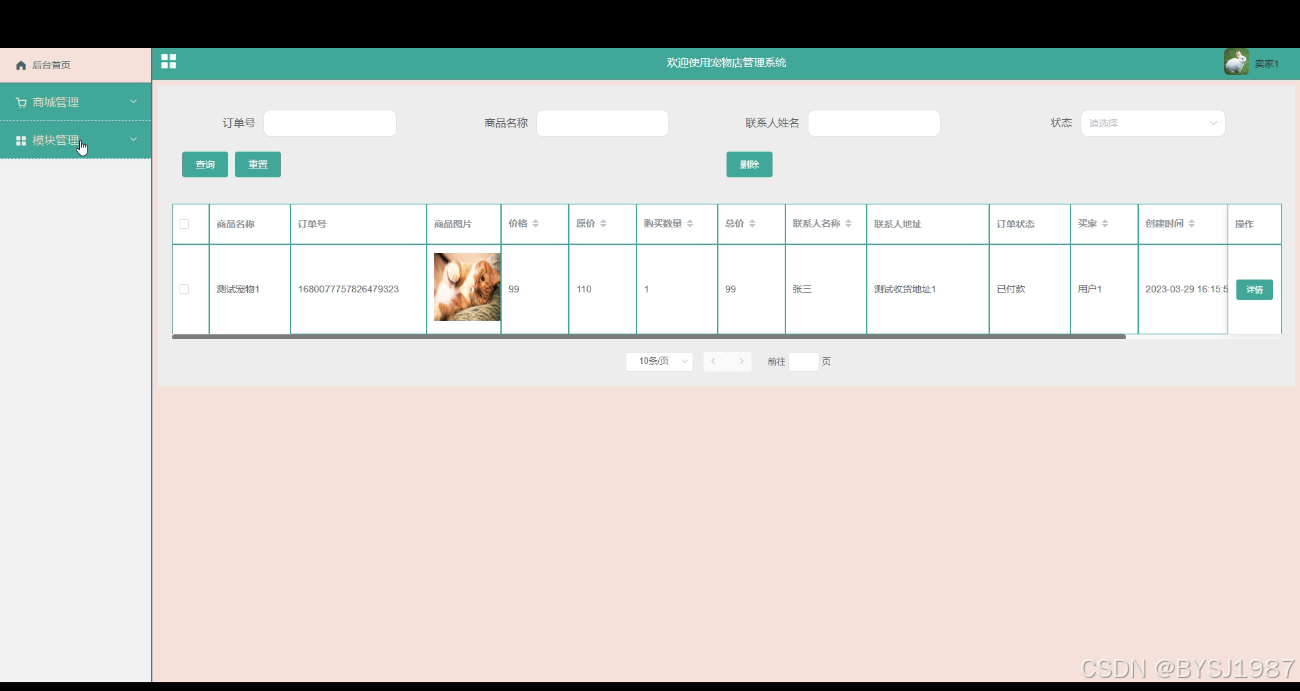 卖家用户登录宠物店管理系统,功能为:后台首页,商城管理(宠物信息,订单列表),模块管理(咨询卖家,物流信息,提醒发货)等功能,如下图所示: