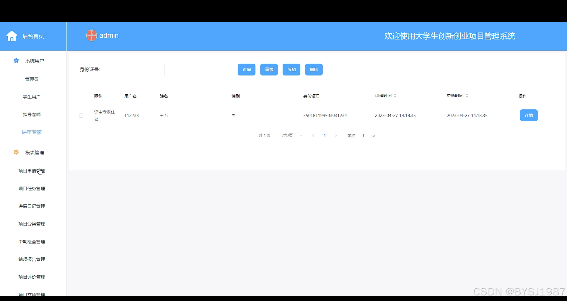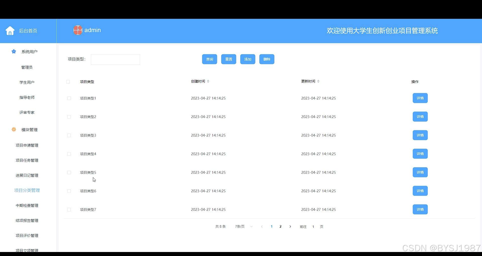 对于管理员可以使用的功能模块主要有系统用户(管理员,学生用户,指导老师,评审专家)项目申请管理,项目任务管理,进展日记管理,项目分类管理,中期检查管理,结项报告管理,项目评价管理,项目立项管理等功能。