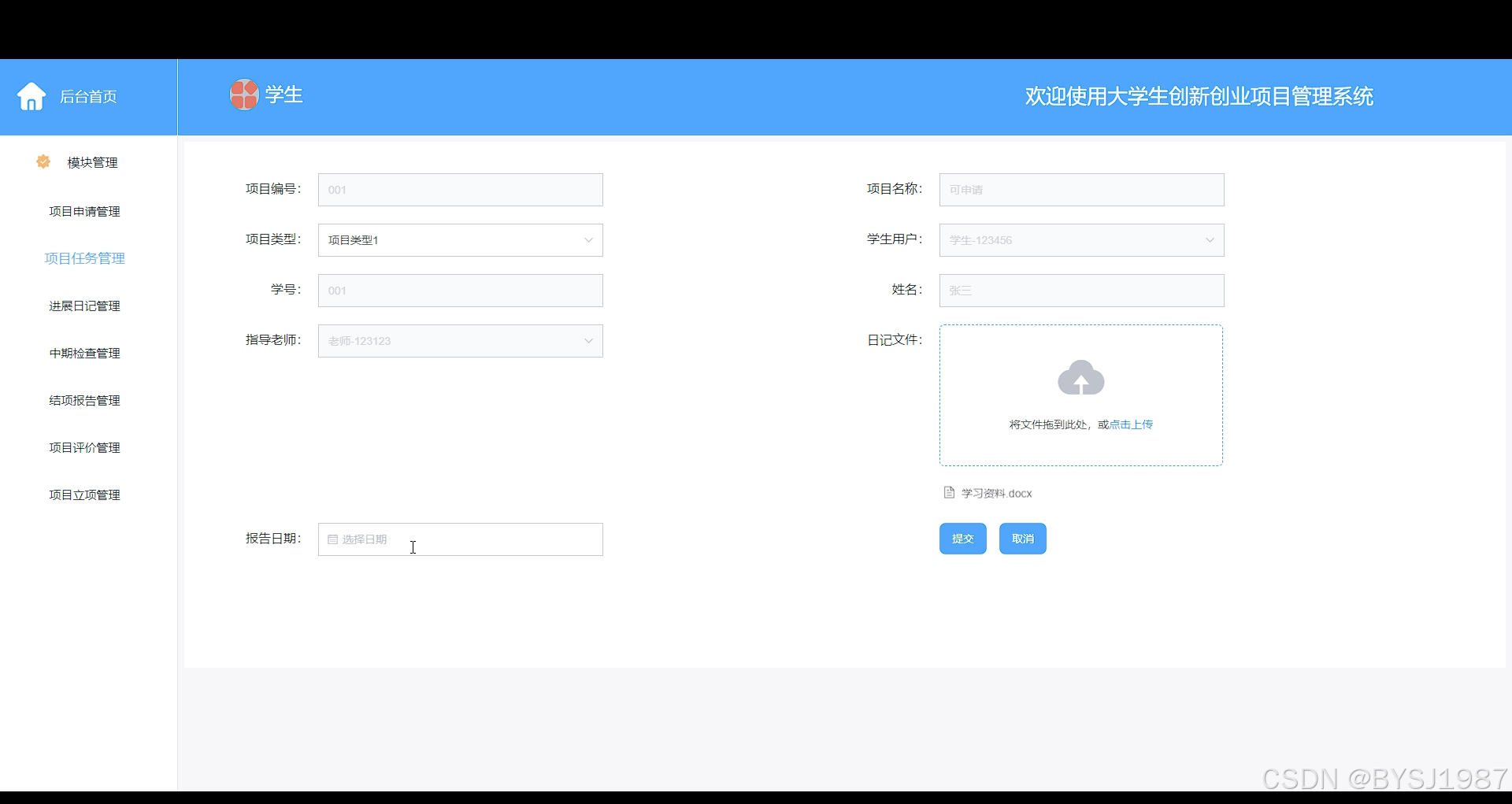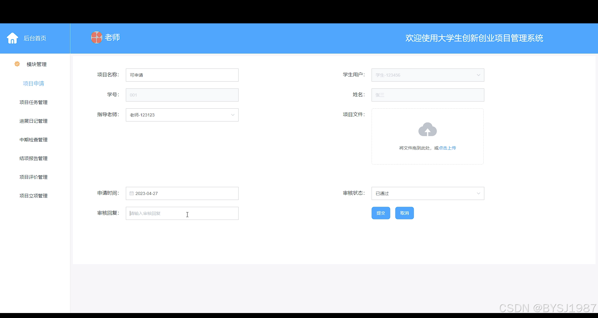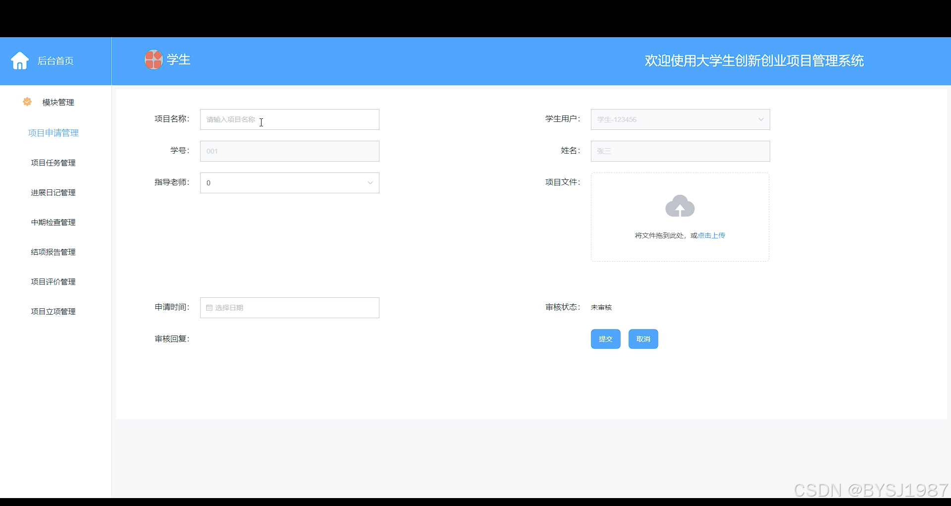 项目申请管理,学生用户通过输入项目名称,学生用户信息,指导老师,上传项目文件等内容提交项目申请,如下图所示。