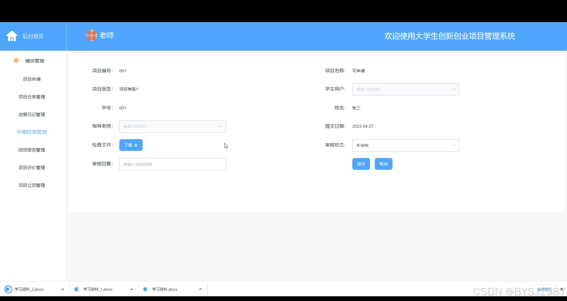 中期检查管理,指导老师在此页面可以维护管理项目中期报告,如下图所示。