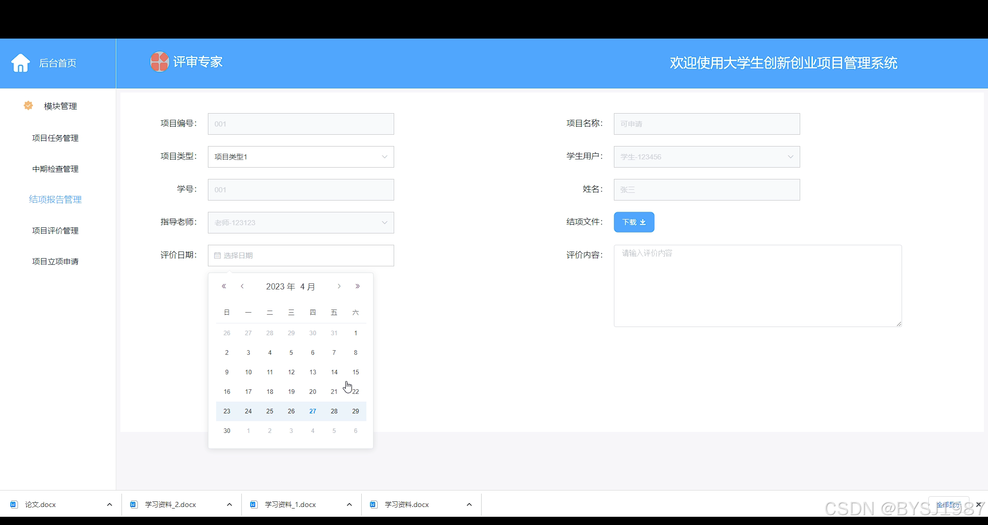项目评价管理,评审专家在此页面可以对学生提交的结项报告进行审核评价,如下图所示。