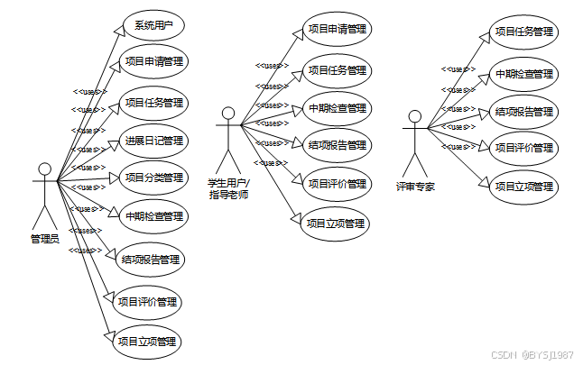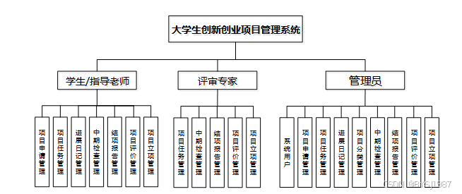 (1)功能要求:首页,系统用户(管理员,学生用户,指导老师,评审专家)项目申请管理,项目任务管理,进展日记管理,项目分类管理,中期检查管理,结项报告管理,项目评价管理,项目立项管理等功能模块。