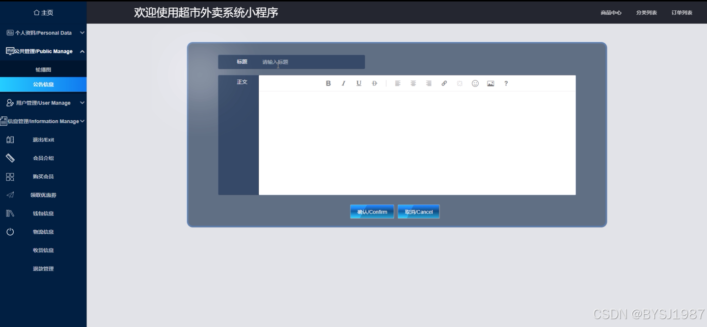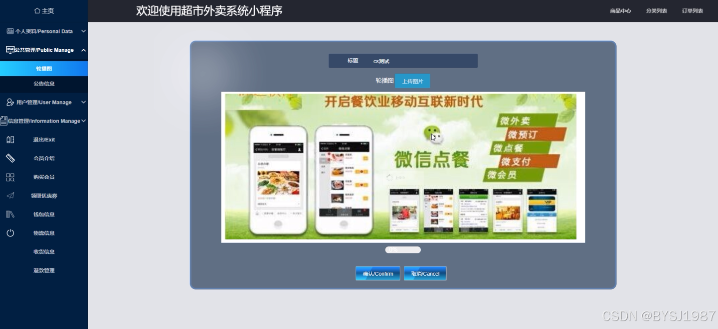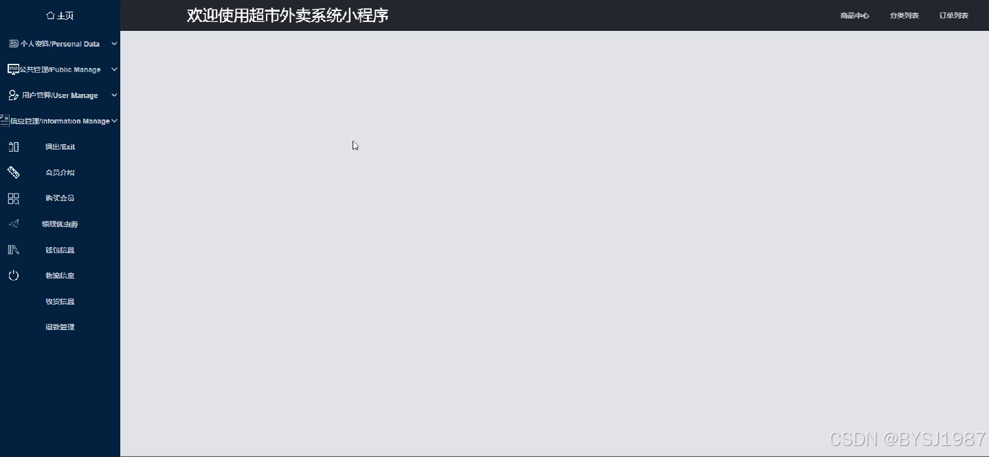 在管理员功能页面可以查看主页、公共管理(轮播图、公告信息)用户管理(管理员、注册用户)信息管理(商品中心、分类列表、订单列表)、会员介绍、购买会员、领取优惠券、钱包信息、物流信息、收货信息、退款管理、个人资料(个人信息、修改密码)等功能。系统管理等内容进行相对应操作,如图5-12所示。