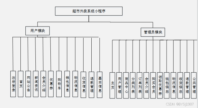 (3)确定好系统使用的技术,进行在线确认系统所划分的用户角色,并且根据用户角色划分确定所要设计的功能模块,对于超市外卖系统小程序的设计主要划分别为管理员和系统用户两个角色,并所使用的功能模块也相应不同,但是系统的数据库实现的内容是交互的,用户可以随时根据自己的需求进行课程信息,对于系统工作人员可以根据自己的分管内容进行在线信息的处理及操作,管理员获取到所有用户的详细数据信息,并根据需求进行第一时间处理解决。