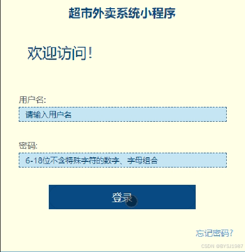 超市外卖系统小程序登录界面,通过填写用户名、密码等信息进行登录,如图5-1所示。