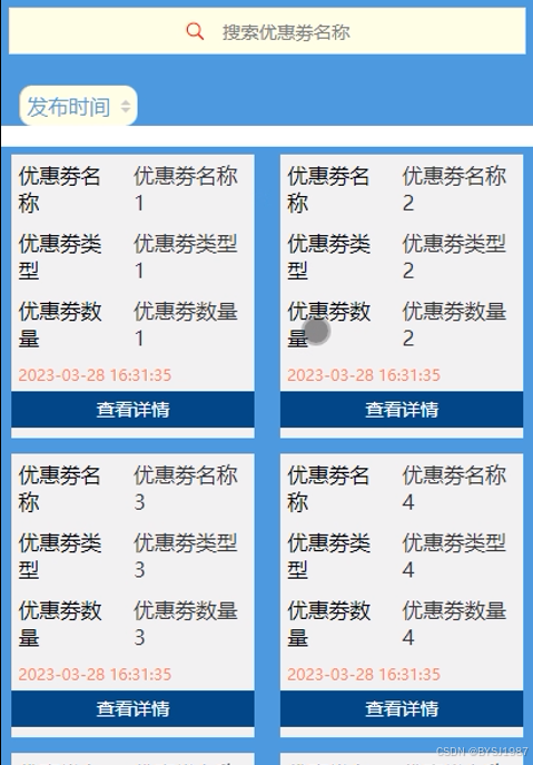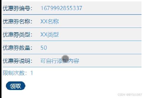 优惠券列表,在优惠券列表页面可通过搜索会优惠券名称进行查看优惠券的详细信息,如:优惠券编号、优惠券名称、优惠券类型、优惠券说明、限制次数等详细信息进行领取,如图5-7 5-8所示。