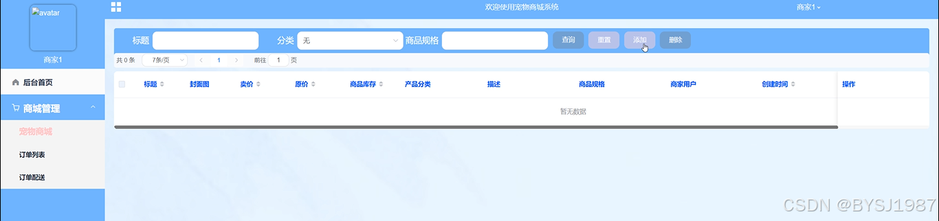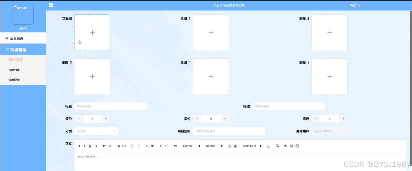 (3)商城管理:用户点击可查看宠物商城、订单列表和订单配送;点击“宠物商城”“添加”,上传封面图和主图,输入标题、描述、原价、卖价、库存,选择分类,输入商品规格,选择商家用户和输入正文,点击“提交”按钮进行添加。同时可查看和管理用户的订单信息,处理订单状态和发货情况。