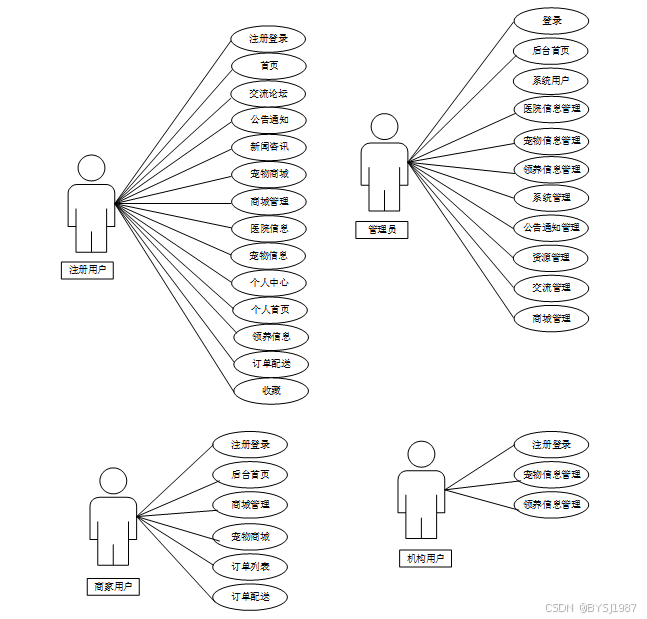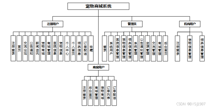 宠物商城系统分为四大角色:注册用户、商家用户、机构用户和管理员。