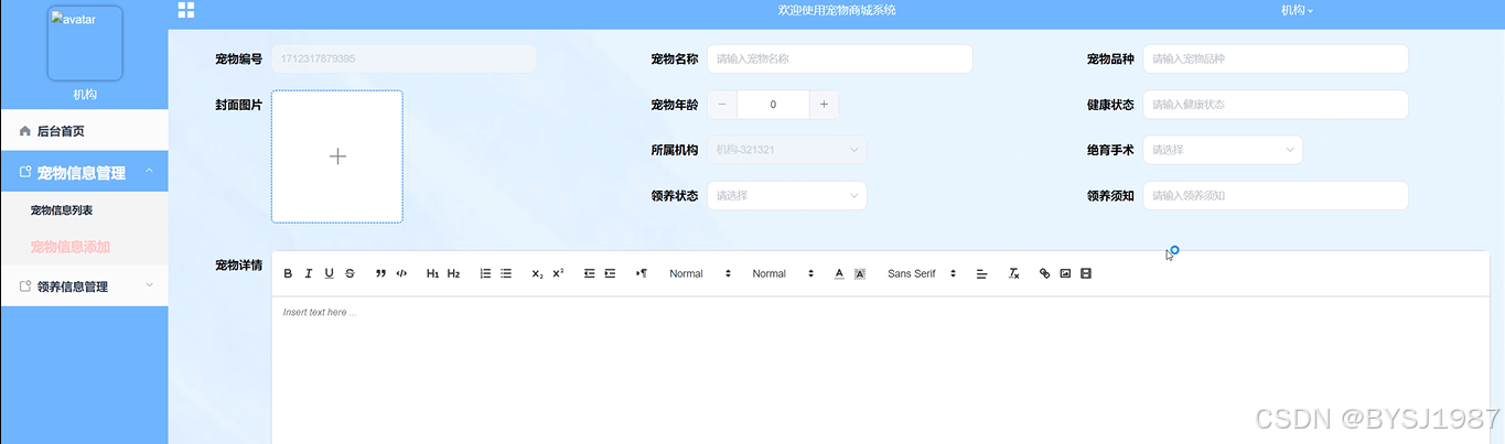 宠物信息管理:用户点击可查看宠物信息列表和宠物信息添加;点击“宠物信息添加”,输入宠物编号、宠物名称、宠物品种,上传封面图片,输入宠物年龄、健康状态,选择所属机构、绝育手术、领养状态,输入领养须知和宠物详情,点击“提交”按钮进行添加。界面如下图所示。