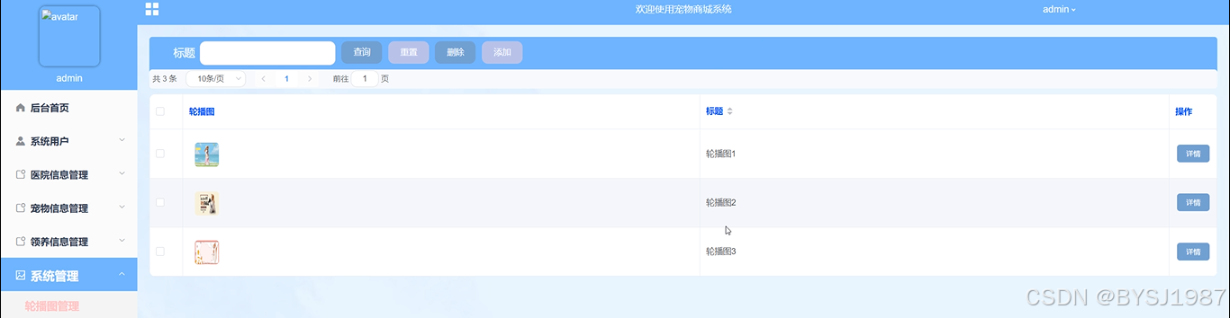 (6)系统管理:当管理员点击“系统管理”时,可查看轮播图; 如需添加新的轮播图,点击右侧“添加”按钮,上传图片,输入标题,点击“确认”按钮进行添加;同时可对轮播图进行增删改查。