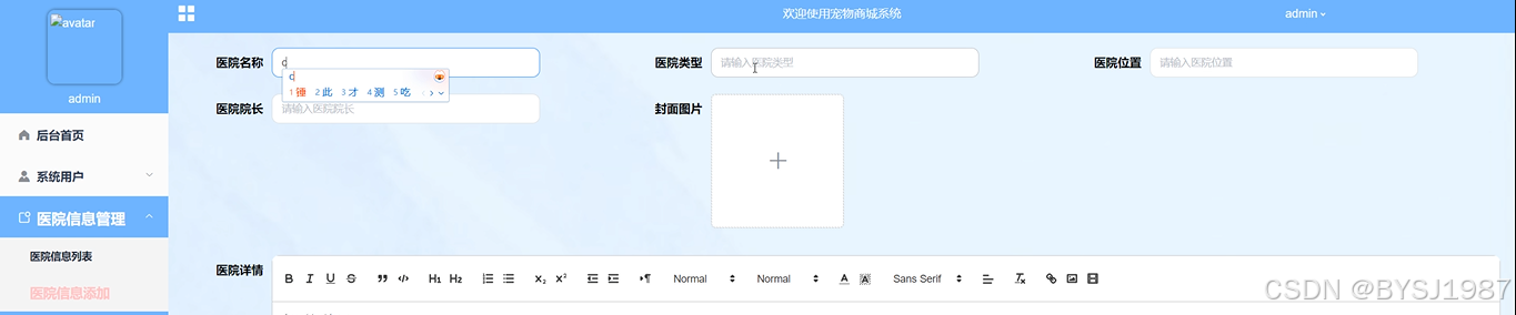 (3)医院信息管理:管理员点击可查看医院信息列表和医院信息添加;点击“医院信息添加”,输入医院名称、医院类型、医院位置、医院院长,上传封面图片和输入医院详情,点击“提交”按钮进行添加。