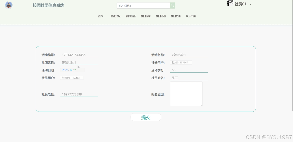 (11)活动报名:用户点击社团活动详情页面中右下角“活动报名”这一按钮以后会跳转到信息填写的界面,其中活动编号+社团名称+活动日期等信息是自动生成的,用户只要填写好报名原因,点击提交等待社长审核即可。