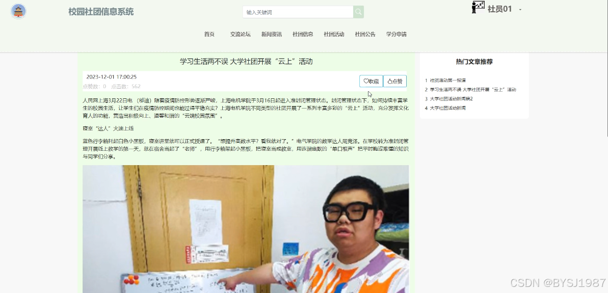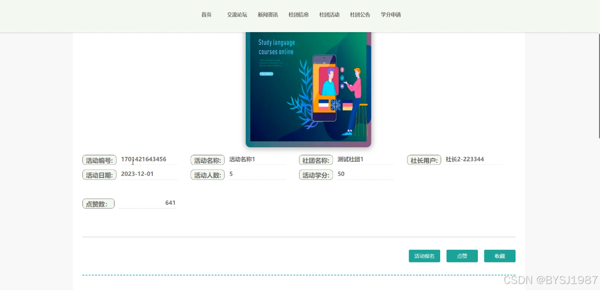 (6)社团活动:用户在前台点击“社团活动”这个菜单按钮,就会显示所有的社团h活动列表,在查询到自己想要报名的活动时,可以进入查看详细的介绍,在这个界面,也可以对社团活动进行报名、点赞、收藏、评论操作。