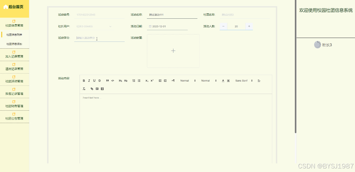 (4)社团活动管理:社长点击“社团活动管理”这一菜单,可以发布新的社团活动信息,也可以对社团活动信息进行增删改查。