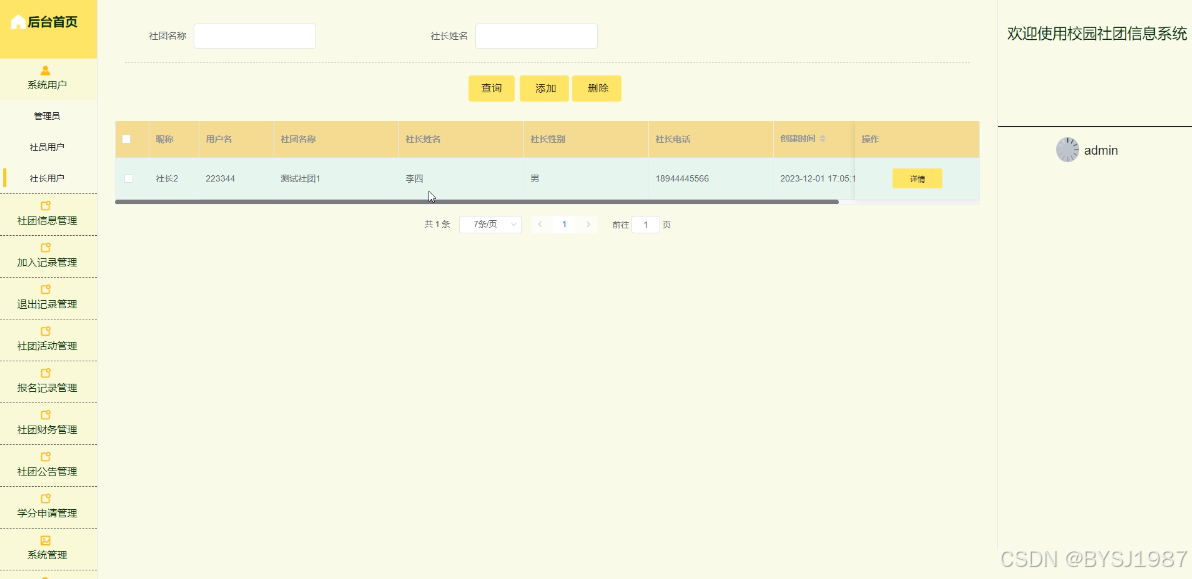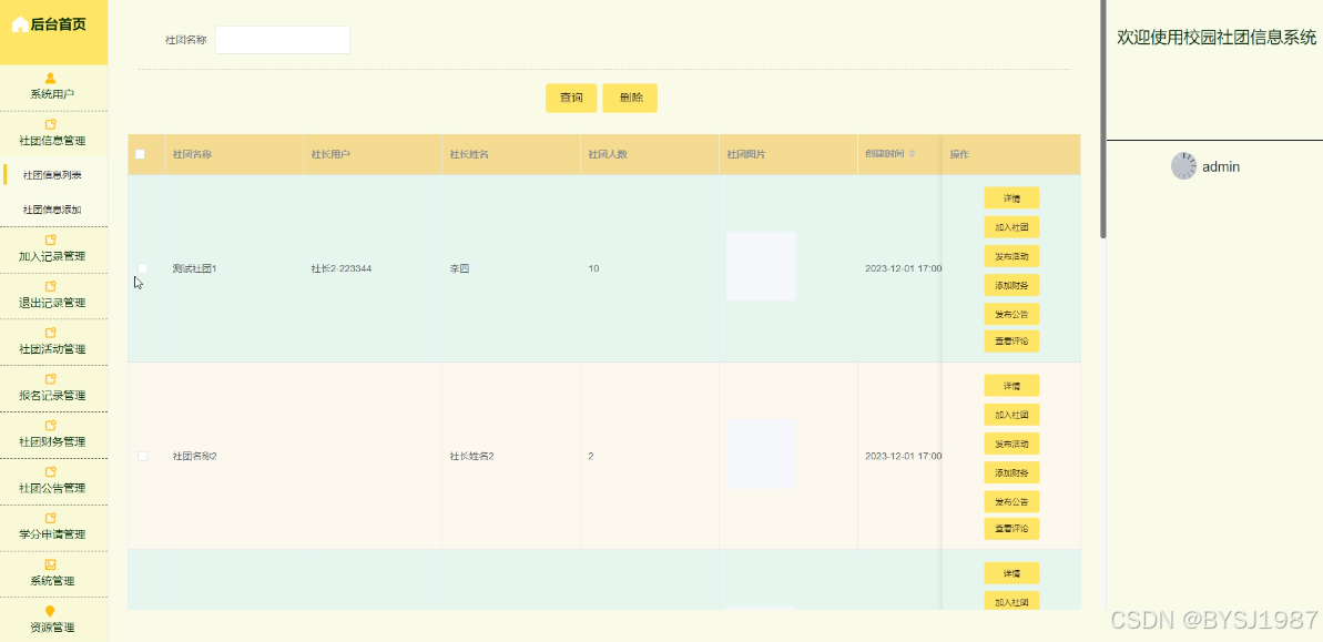 (1)社团信息管理:社长点击“社团信息管理”这一菜单,可以查看到自己添加的社团信息管理信息,也可以对社团信息管理进行增删改查,同时也可以查看前台用户对社团提交的评论。