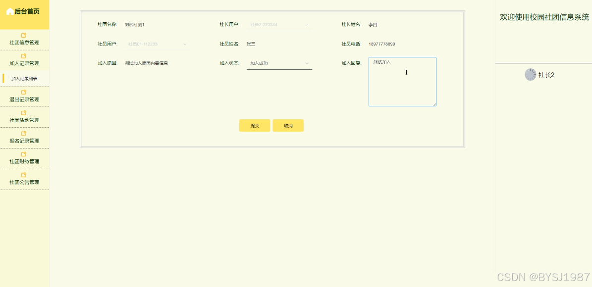 (2)加入记录管理:社长点击“加入记录管理”这一菜单,可以查看到用户提交的加入社团申请信息,可以对其进行审核以及审核回复。