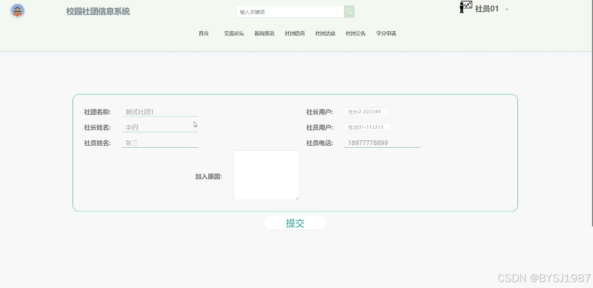 (10)加入社团:用户点击社团详情页面中右下角“加入社团”这一按钮以后会跳转到信息填写的界面,用户只要填写好加入原因,点击提交以后加入社团就完成一半了。
