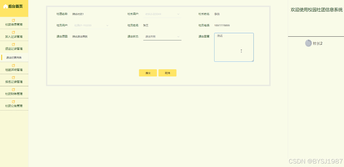 (3)退出记录管理:社长点击“退出记录管理”这一菜单,可以查看到用户提交的退出社团申请信息,可以对其进行审核以及审核回复。