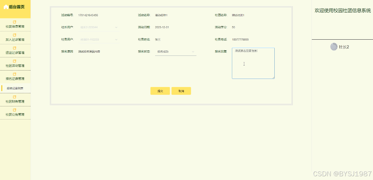 (5)报名记录管理:社长点击“报名记录管理”这一菜单,可以查看到用户提交的活动报名申请信息,可以对其进行审核以及审核回复。