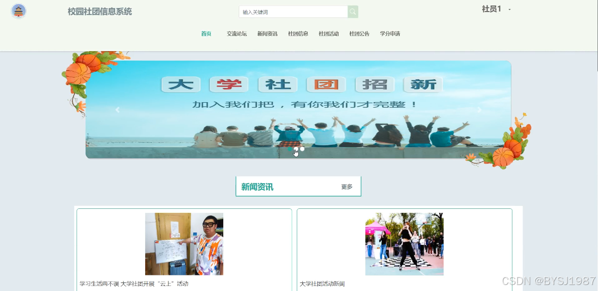 (2)查看校园社团信息管理系统的首页信息:校园社团信息管理系统的首页信息首页、交流论坛、新闻资讯、社团信息、社团活动、社团公告、学分申请、我的账户、个人中心等。