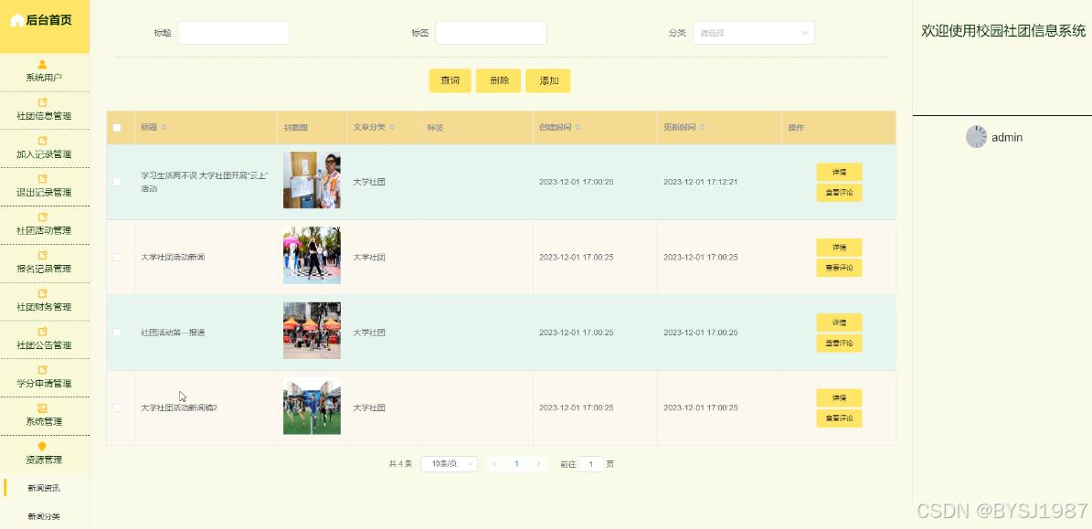 (9)社团公告管理:管理员点击“社团公告管理”菜单可以查看社团的公告列表,点击详情查看信息,进行增删改查。
